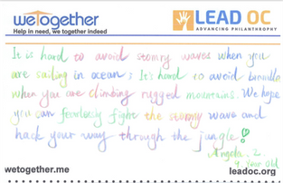 WeTogether , LeadOC have been working with Miracles for kids and Sapphire Culinary Group, delivering meals, groceries and PPEs to 500 families with critically-ill kids and also were impacted by this current pandemic. The events lasted three weeks and covered families in Orange County, Los Angeles County, and Riverside County. Kids from donors' side also participated by writing letters to those families. Please see below press release and some of the works from the little angels!